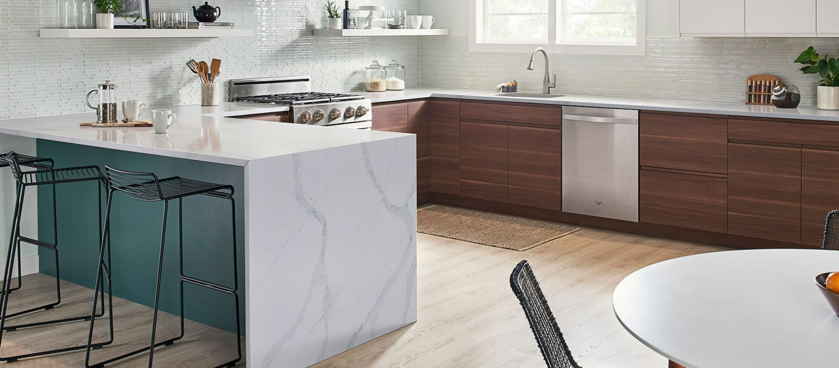 This coveted Italian marble look quartz features a milky-white backdrop and gorgeous long linear veining for subtle elegance that wows.